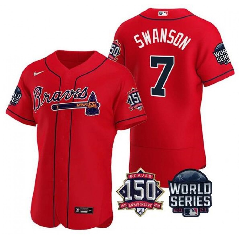 Men's Atlanta Braves #7 Dansby Swanson 2021 Red World Series With 150th Anniversary Patch Stitched Baseball Jersey