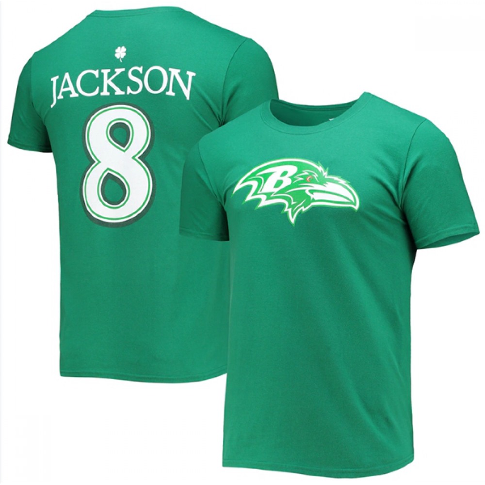 Men's Baltimore Ravens #8 Lamar Jackson Green St. Patrick's Day Icon Player T-Shirt