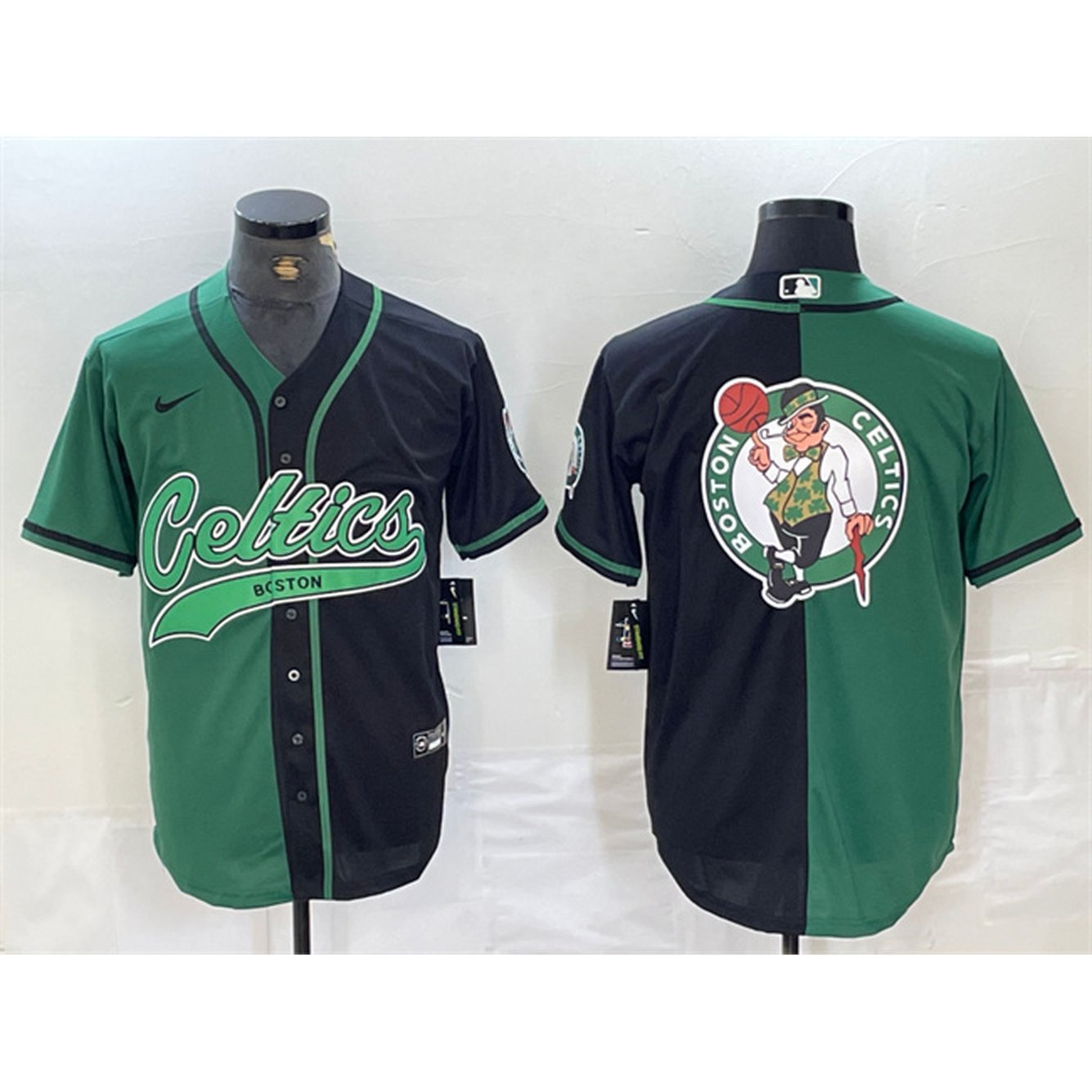 Men's Boston Celtics Team Big Logo With Patch Green/Black Split Stitched Baseball Jersey